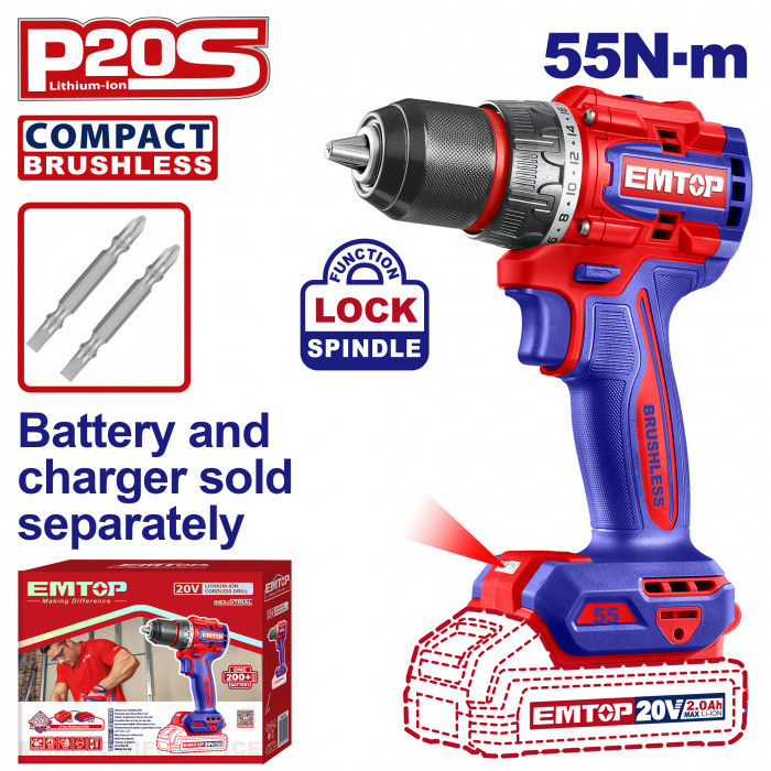 EMTOP aku set, vrtací šroubovák 20V 55Nm, akumulátor 2.0Ah, nabíječka 4A, taška