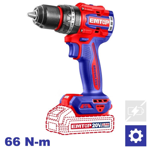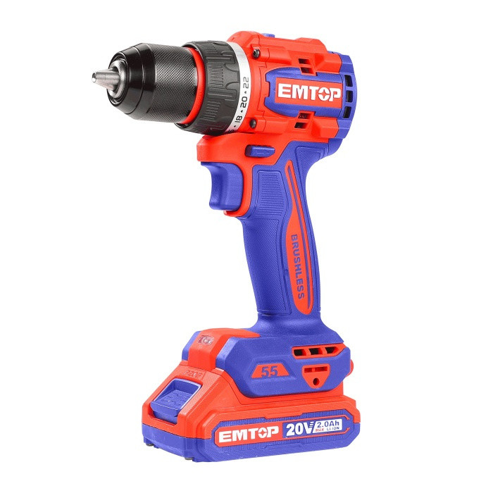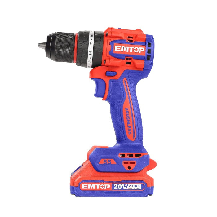 EMTOP aku set, vrtací šroubovák 20V 55Nm, akumulátor 2.0Ah, nabíječka 4A, taška