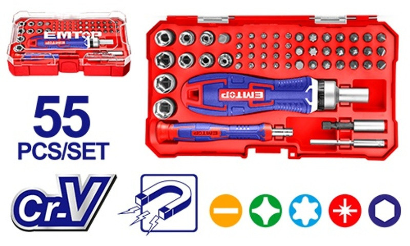 Sada bitů a hlavic s ráčnovým šroubovákem 55 ks